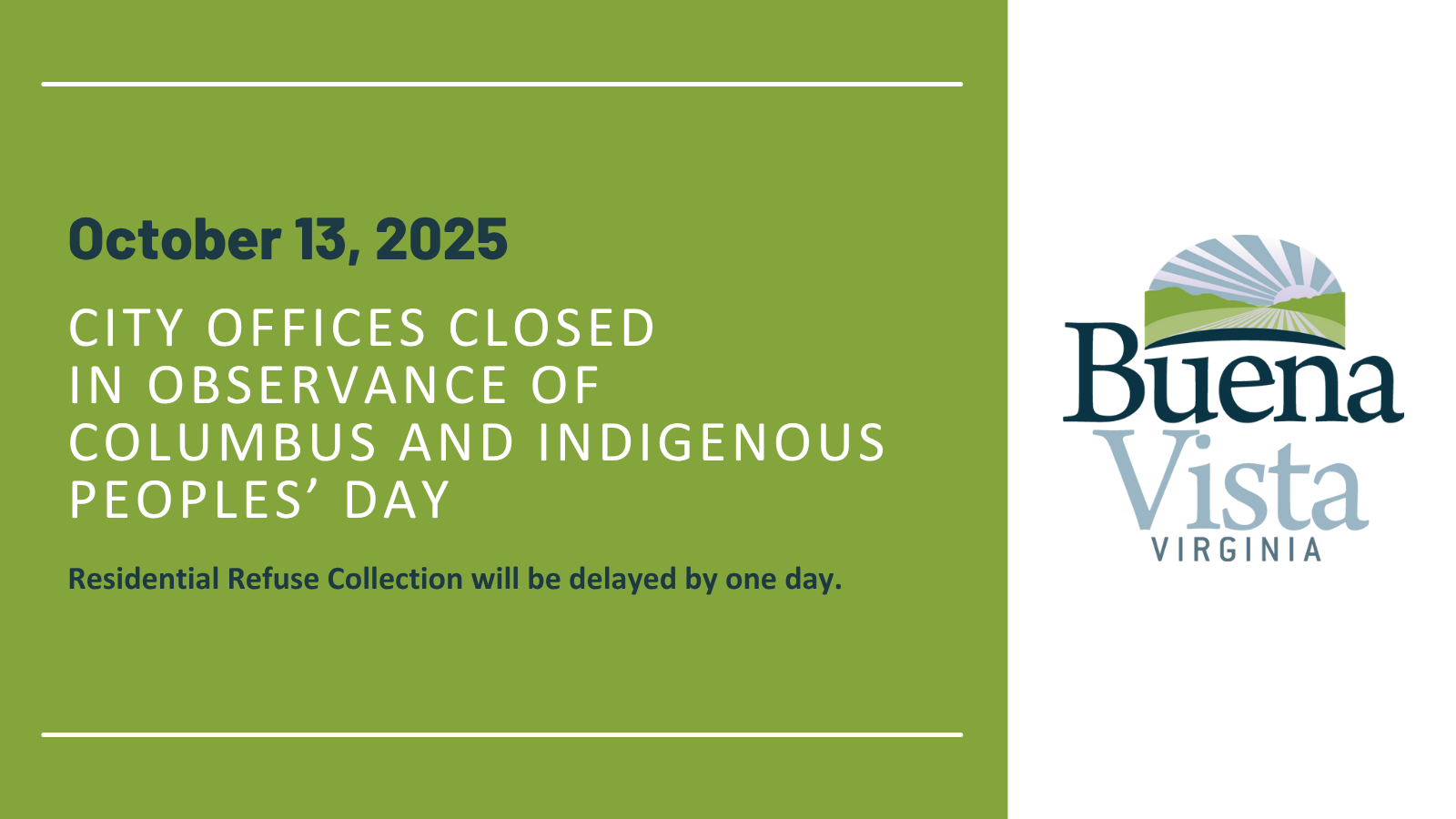 City Offices will be closed October 13, 2025 in observance of Columbus and Indigenous Peoples’ Day Residential Refuse Collection will be delayed by one day.