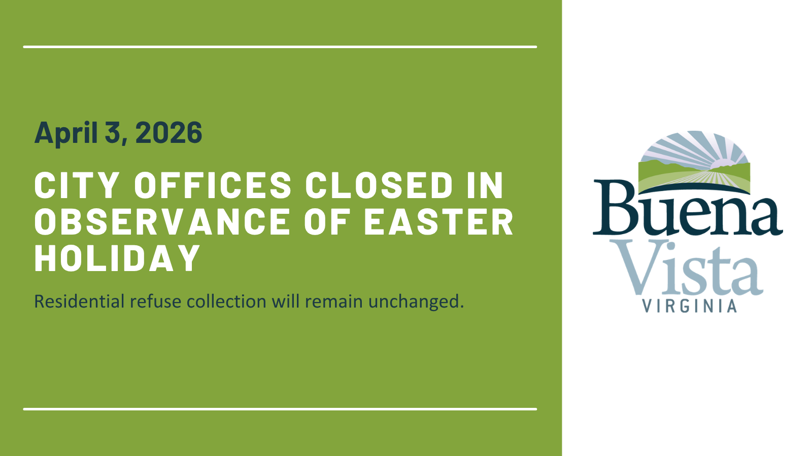 City Offices Closed in Observance of Easter Holiday City offices will be closed Friday April 3rd in observance of Easter Holiday. Residential refuse collection will remain unchanged. 03 Apr All Day